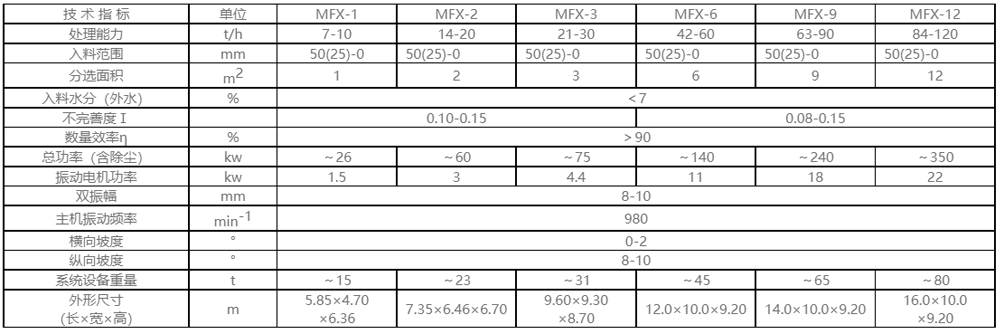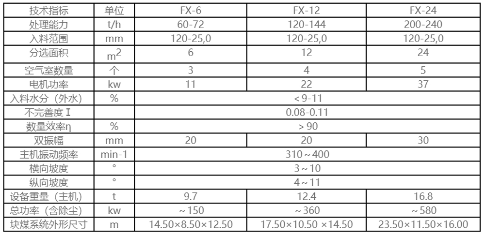 FX型干選設(shè)備,單位面積處理量大,中煤及矸石在床面運(yùn)動(dòng)時(shí)間長(zhǎng),分選充分,不易帶煤,分選效果好。入料范圍寬,可以達(dá)到120-0mm,當(dāng)原煤中的末煤量小于15-20%時(shí),可以不分級(jí)直接入選,有利于工藝的簡(jiǎn)化。另外,對(duì)原煤外水適應(yīng)性強(qiáng),外在水分在9-11%時(shí),也能進(jìn)行有效分選。此設(shè)備更適合于塊煤的分選。